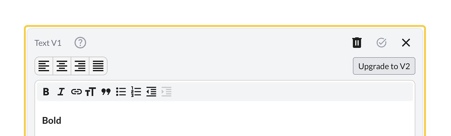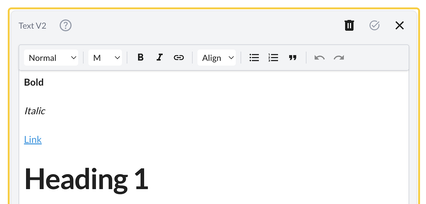 As of April 20, 2026, the Text block has been upgraded to Version 2. This documentation will focus on this version. You can convert text created with Version 1, but upgrading to Version 2.